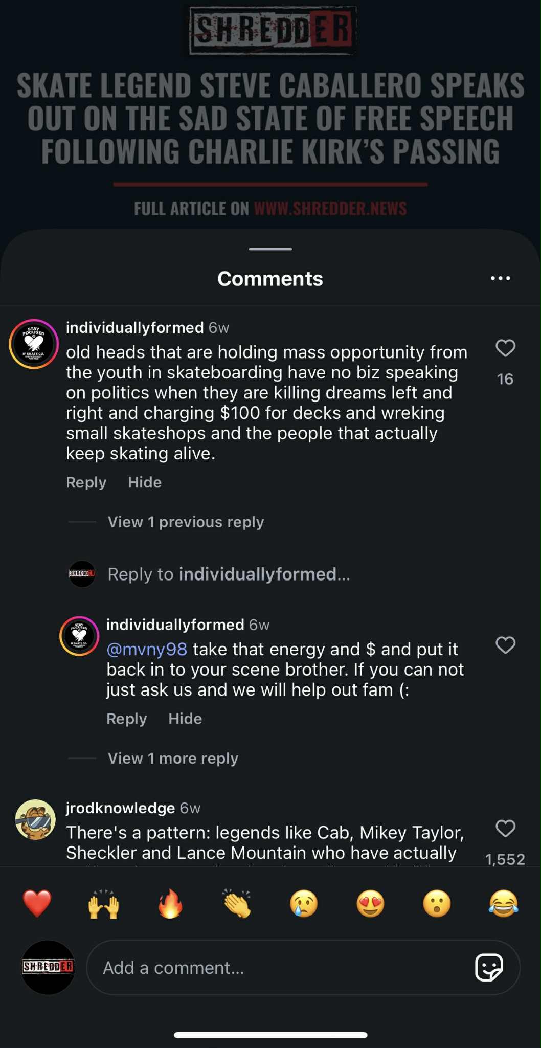 As we previously reported, skate legend Steve Caballero came out talking about free speech and a bunch of other old pros dropped their thoughts after Charlie Kirk passed and man, the way people are reacting in the scene is wild.