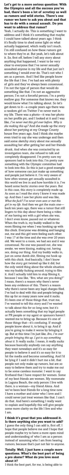 Thrasher: Let's get to a more serious question: With the Olympics and all the success you've had, there's been a lot of scrutiny as well as rumors and wild stories. There's one rumor we have to ask you about and that has to do with a sexual assault. Do you want to address that rumor?